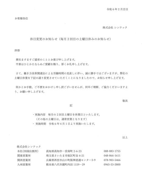 休日変更のお知らせ(2024年4月1日より、毎月2回目の土曜日休み)